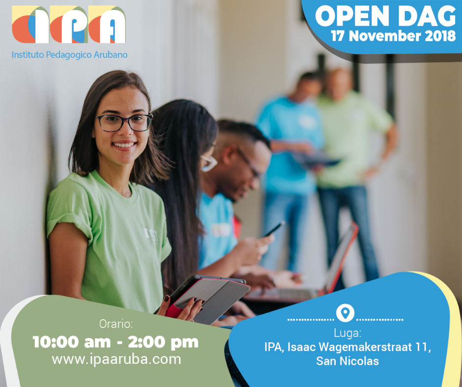 IPA ta invita tur studiante di HAVO, VWO y MBO nivel 4 y tur otro persona interesa pa cuminsa un estudio pa maestro pa asisti na IPA su Dia Publico (Open dag) dia 17 di November 2018. IPA su Dia Publico lo ta di 10or di mainta te 2or di atardi na IPA (Isaac Wagemakerstraat 11, San Nicolas).