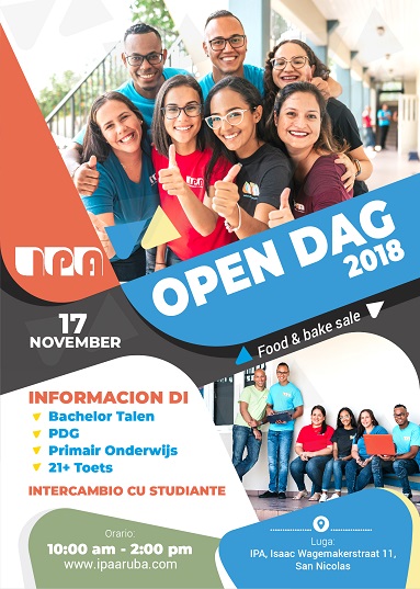 Diasabra dia 17 di november 2018 Instituto IPA ta tene su Dia Publico (Open dag) anual. IPA ta un instituto di enseñansa superior cu ta forma maestro di scol preparatorio, di scol basico y di scol avansa pa enseñansa di Aruba. IPA su Dia Publico lo ta di 10or di mainta te 2or di atardi na IPA (Isaac Wagemakerstraat 11, San Nicolas).