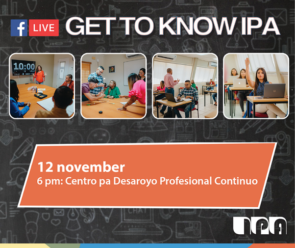 Den cuadro di e asina yama ‘Get to know IPA’, e instituto lo tene un live session di CDPC dia 12 di november pa 6or di atardi riba e pagina di Facebook Instituto Pedagogico Arubano. Durante e live session lo amplia, entre otro, riba kico ta CDPC y lo trata e cursonan di recapacitacion cu CDPC ta ofrece durante aña academico 2020-2021 y e procedura pa inscribi.