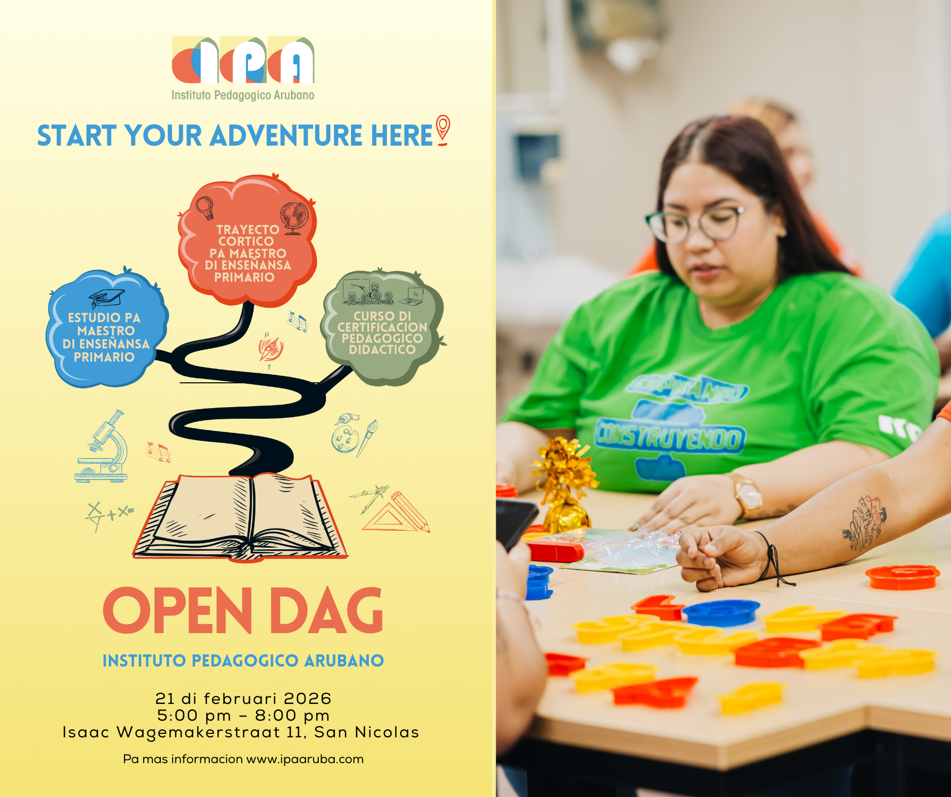Durante open dag di IPA, dia 21 di februari 2026, lo ofrece tres sesion di informacion general di e Estudio pa Maestro di Enseñansa Primario cu bo lo por atende. E orario di sesion 1 ta 5:30 pm, di sesion 2 ta 6:35 pm y di sesion 3 ta 7:40 pm.