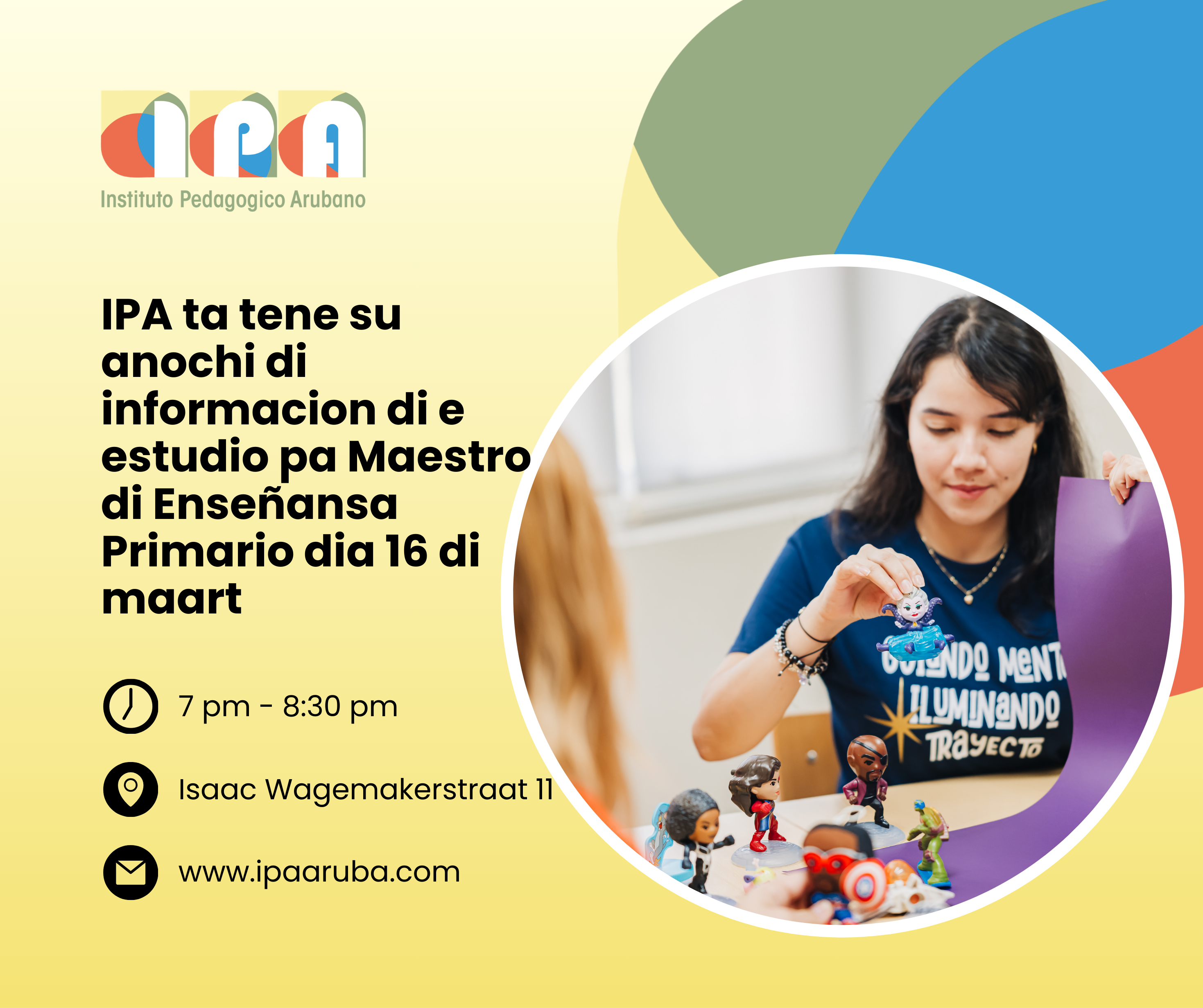 Dialuna dia 16 di maart 2026 Instituto Pedagogico Arubano (IPA) ta tene un anochi di informacion pa tur studiante cu tin diploma di havo, vwo of mbo/EPI nivel 4 of cu ta den examenklas di un di e scolnan menciona, cu ta interesa pa haci e estudio pa Maestro di Enseñansa Primario na IPA. E estudio aki ta forma maestro cu ta cualifica pa duna les na mucha di kleuter y of scol basico.
